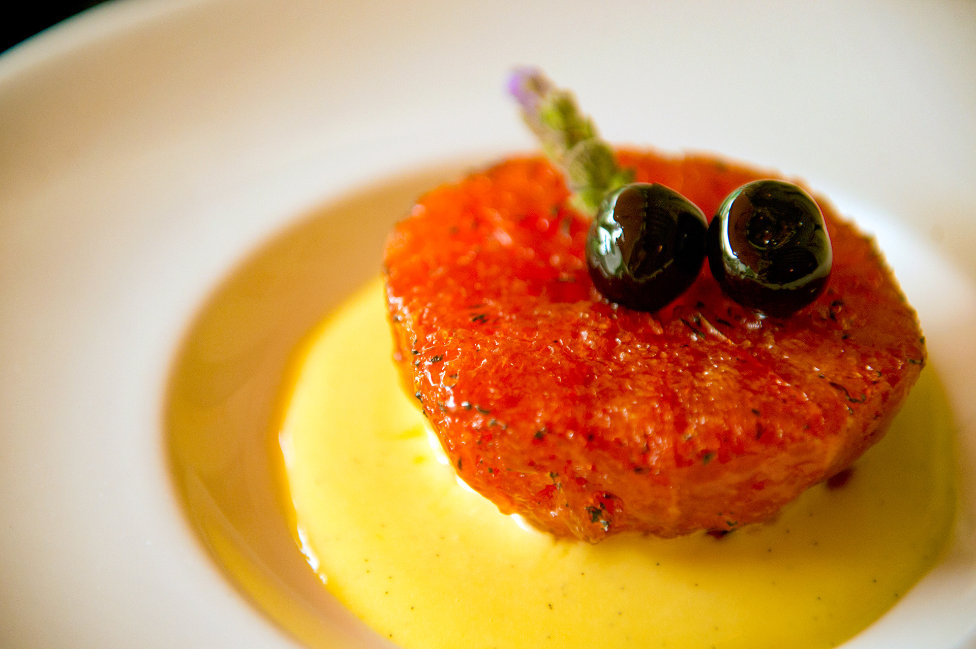 Australian Lamb Chops, brown butter spaghetti squash, crisp goats' cheese ravioli and Pluot preserves.