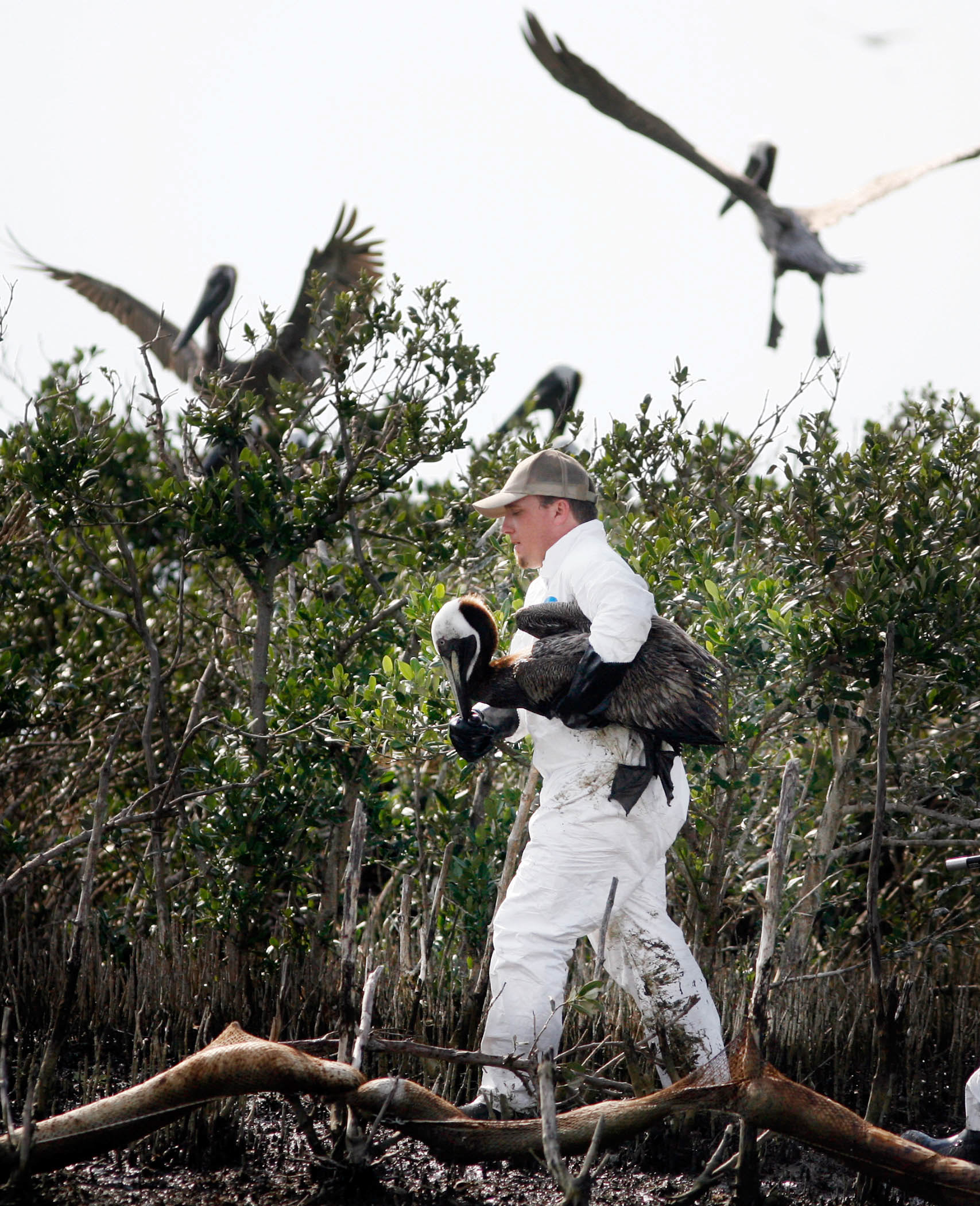 A pelican sits in the grass on an oil-stained island near Grand Isle Tuesday.