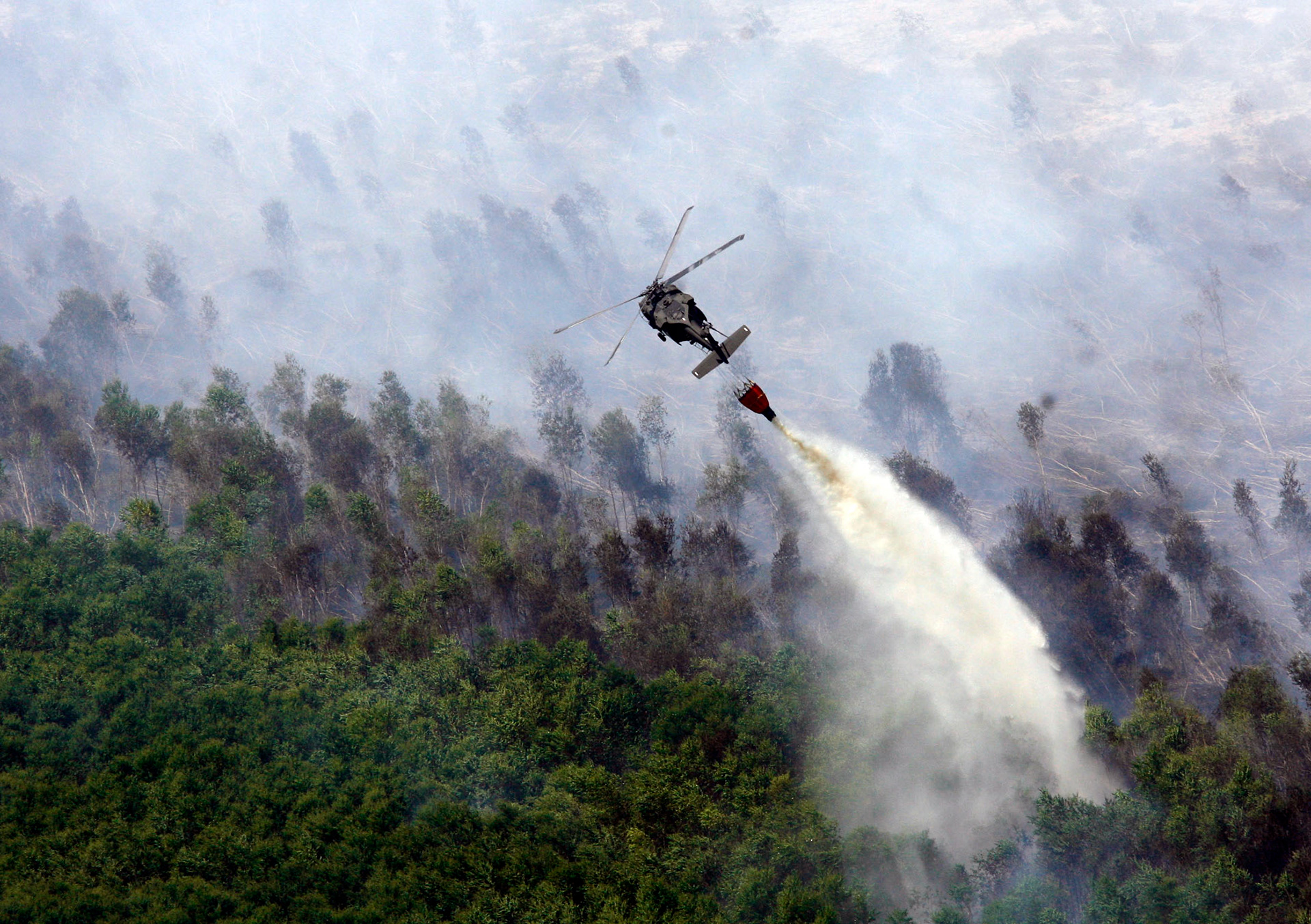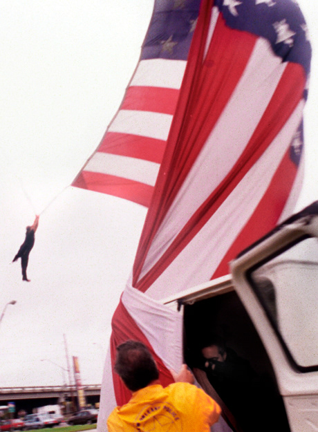 Deputy Lloyd Dupuy is pulled up by a giant flag whipped by high winds as Hurricane Opal approaches the Gulf Coast.