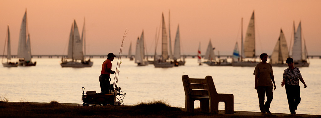 A man pedals his bike down Canal street as seen from the Interstate 10 overpass. The late afternoon sun throws much of the street in shadow.