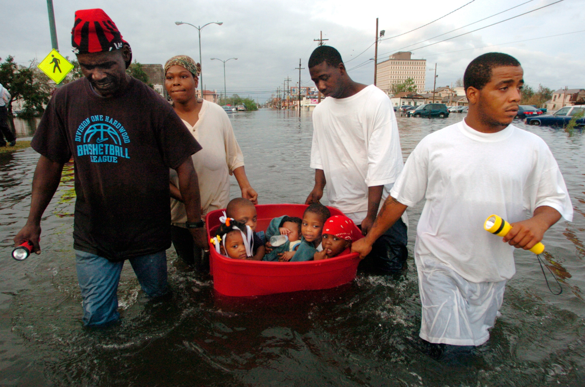 John Rainey, John Rainey, Jr and Courtney Davis help Terry Fox, second from left, transport her kids and those of a family member down flooded South Broad street Monday.